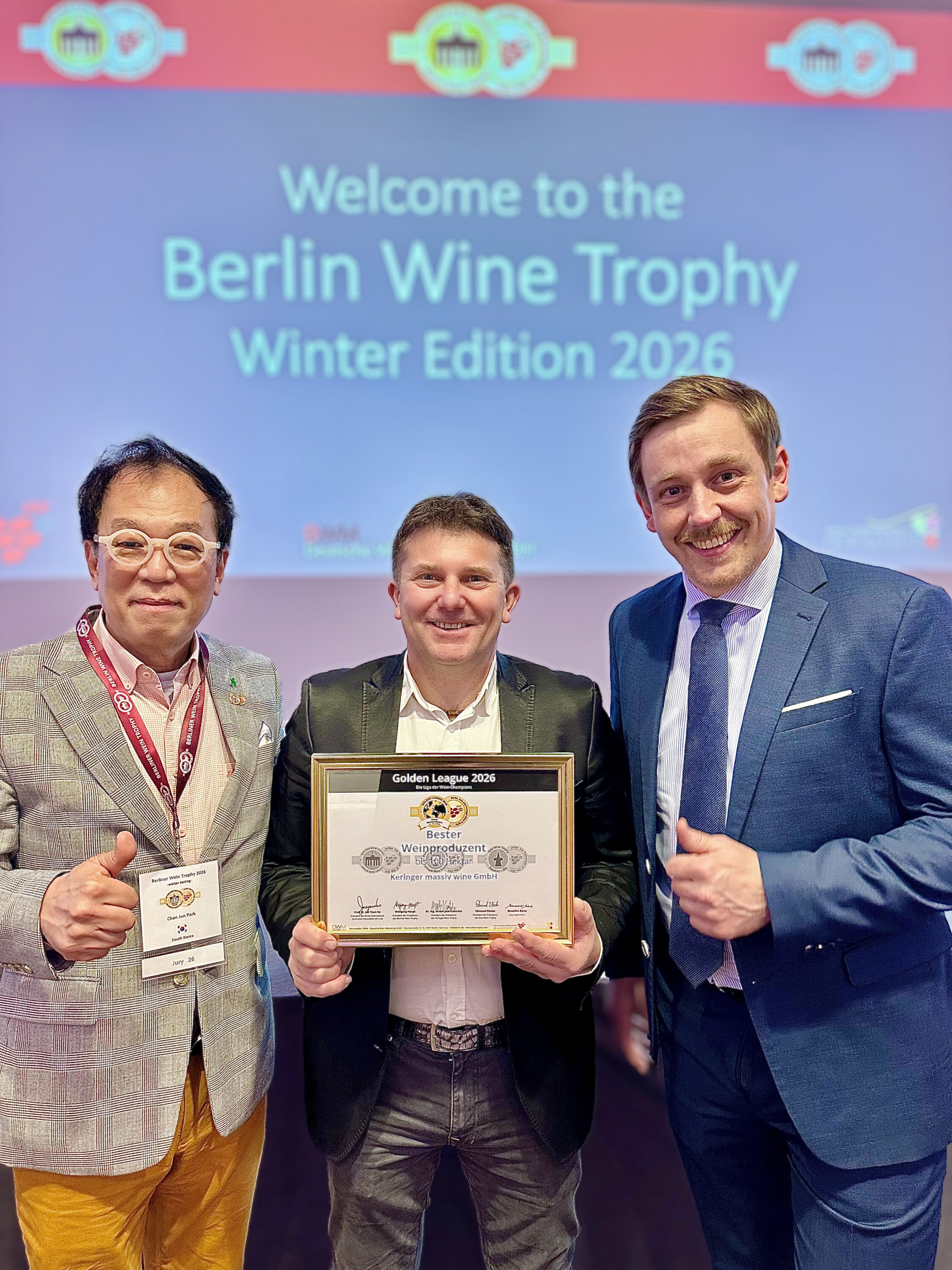 Ein besonderer Moment: Die offizielle Urkundenüberreichung zum Gesamtsieg der Golden League. Nach Top-Platzierungen bei der Asia Wine Trophy, der Portugal Wine Trophy und der Berliner Wine Trophy durfte ich die Auszeichnung zum internationalen Champion bzw. zum Besten Weinproduzenten in der Kategorie bis 100 ha entgegennehmen. Im Bild 1: (v.l.n.r.): Henk Gibramczik (Operation Manager der Berliner Wine Trophy / DWM) gratuliert Robert Keringer (Geschäftsfüher / Inhaber Weingut Keringer) und überreicht die Urkunde. Bild 2: (v.l.n.r.): Chan Jun Park (Asia Director der Asia Wine Trophy & Vizepräsident der KISA), Robert Keringer (Geschäftsfüher / Inhaber Weingut Keringer) und Henk Gibramczik (Operation Manager der Berliner Wine Trophy / DWM).“